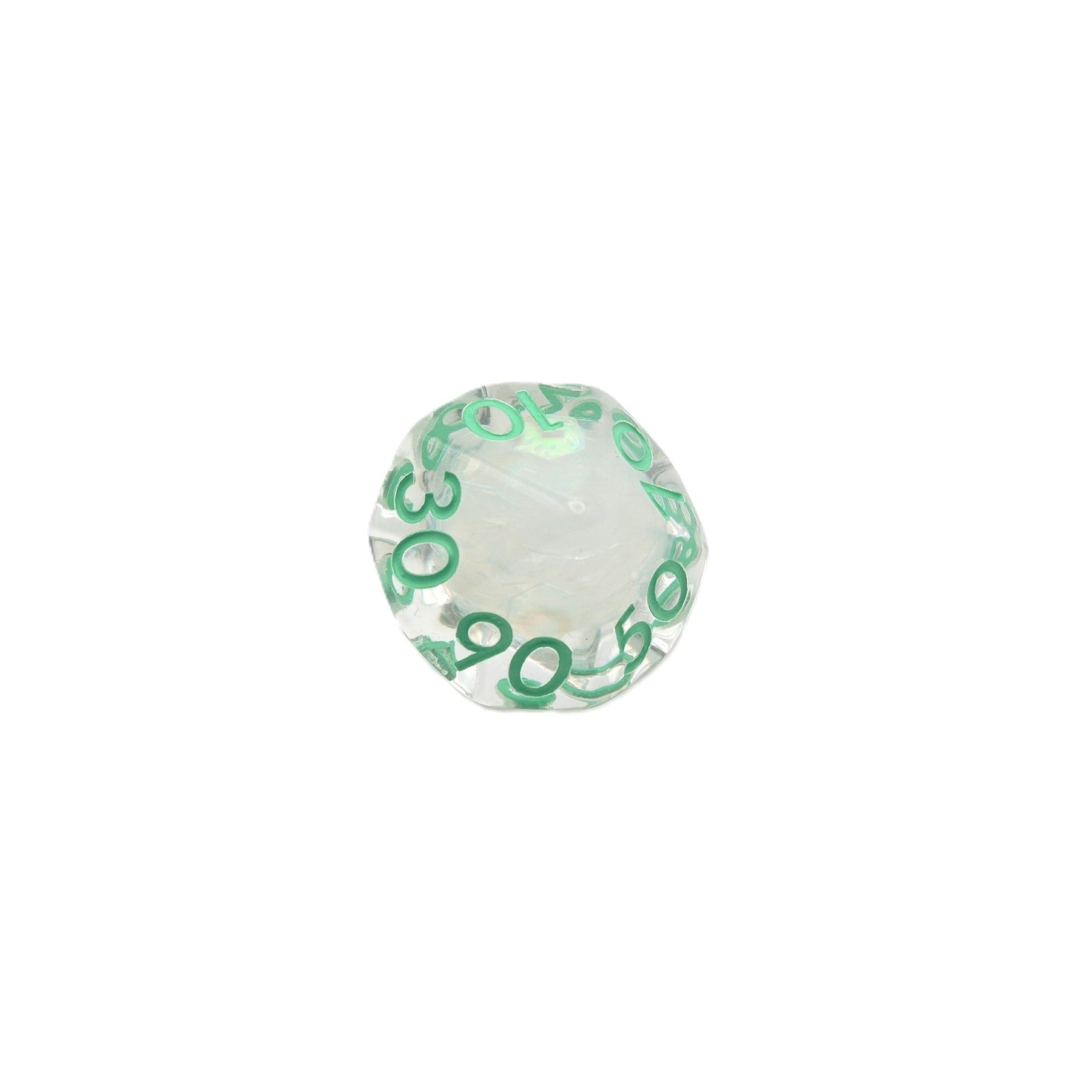 Shimmering foil hexagons in clear resin dice with green numbers.